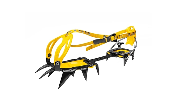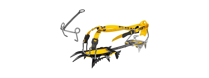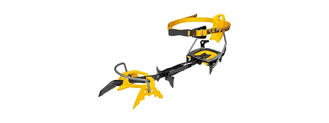 Es nutzt 10 Zacken beim Gehen in Eis und Schnee und 12 Zacken beim Queren im Hang und bietet besten Halt beim Abstieg und Queren. Die hybride Konstruktion bezieht sich auf einen Stahlteil vorne und einen Aluteil hinten, wodurch das Steigeisen wesentlich leichter wird. Es ist mit manuell verstellbaren Schiene ausgestattet und kommt inklusive Anti-Stoll-Platte.