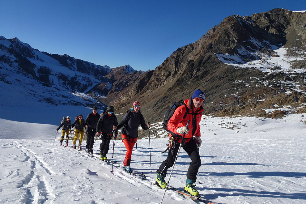 Leider hat es auch im Pitztal zu diesem Zeitpunkt noch nicht richtig geschneit und dementsprechend sind die Schneeverhältnisse eher dürftig. Doch selbst harter Altschnee und Bruchharsch können die Motivation der Gruppe nicht brechen. Als wir anschließend unsere Gletschertour starten, steigen wir als Seilschaft auf, denn es ist immer auch mit Spalten zu rechnen. Im gemeinsamen Takt geht es bei prallem Sonnenschein und Kaiserwetter unserem Gipfel entgegen.