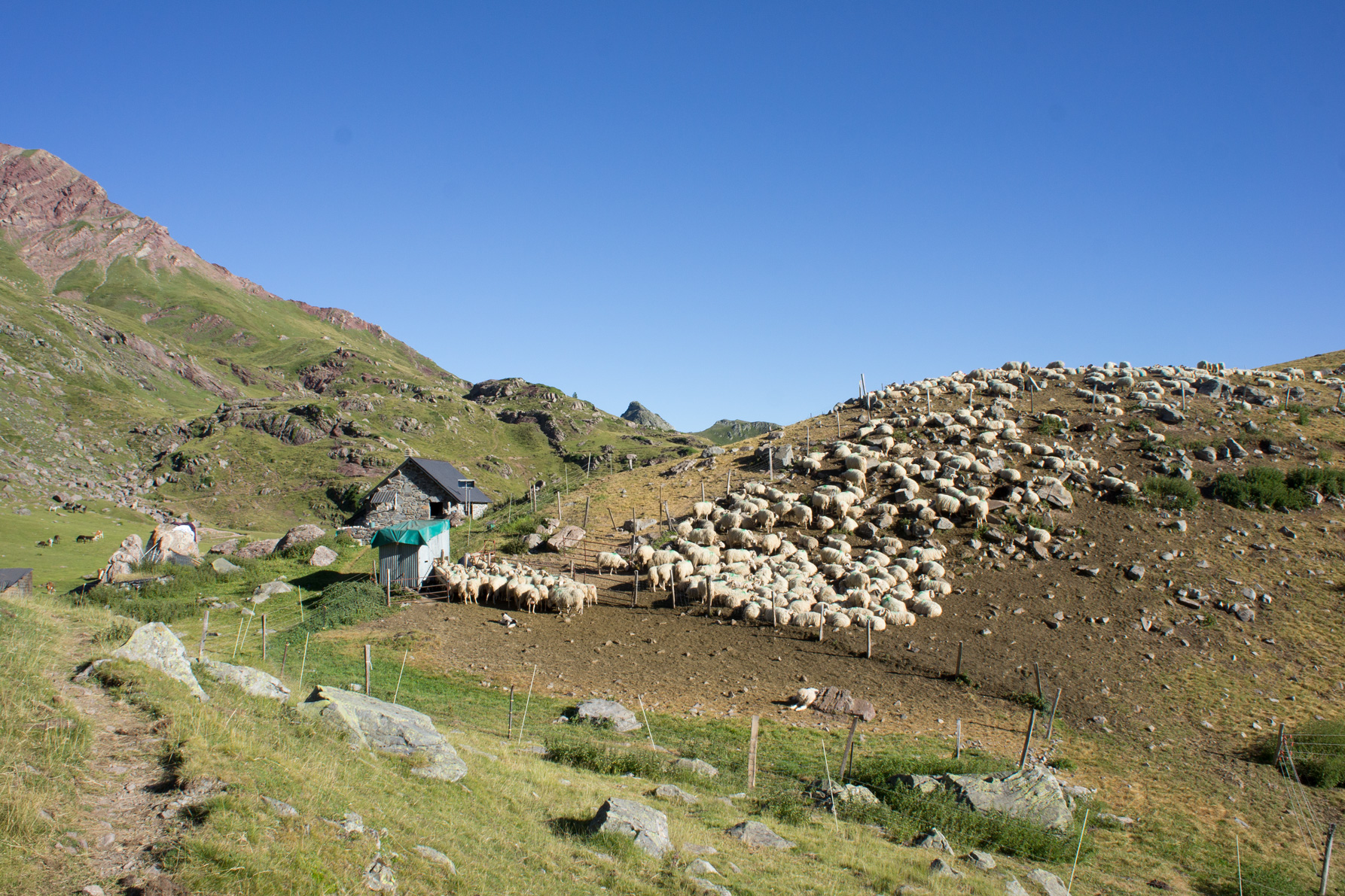 Der nächste Tag bringt beeindruckend schönes Wetter – und eine lange, aussichtsreiche Kammwanderung. Die Breite des gesamten Gebirgszugs der Pyrenäen nimmt ab, man erahnt das Tal des Ardour und die französichen Niederungen an der Biskaya in der Ferne. Ein paar Schafherden, einige wenige Tageswanderer – ansonsten nur die Weite, der Pfad und wir. Es ist schon beeindruckend, wie wenig andere Leute wir hier treffen, obwohl wir uns mitten in der Hochsaison befinden.
