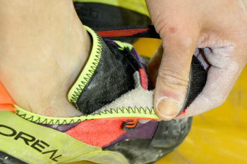 Mit dem kleineren Klettverschluss lässt sich die Weite im Mittelfußbereich leicht variieren. Hier wird ein robuster Kletterriemen als Zugmaterial eingesetzt. Der obere, große Klett, welcher durch eine Metallschnalle verläuft sorgt wie auch bei vielen anderen Slippern für den festen Sitz im Schuh. Dadurch wird ein unabsichtliches herausrutschen aus dem Schuh verhindert.