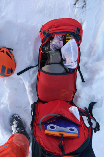 Das „+“ steht beim Neo 35+ für ein erweiterbares Packvolumen, indem die Deckelklappe nach oben verlängert werden kann. Du gewinnst damit ca. weitere 5 Liter! Besonders praktisch, wenn Du sehr platzraubende Ausrüstung transportieren musst wie z.B. ein Seil oder Steigeisen. Die haben wir auch dabei. Dazu noch einen Klettergurt, ein paar Eisschrauben, Reepschnüre, Kletterhelm und Eisgeräte. Alles kein Problem für den Neo 35+! Ich möchte ihn schon fast als kleines Raumwunder bezeichnen, als ich vor dem fertig gepackten Rucksack stehe.