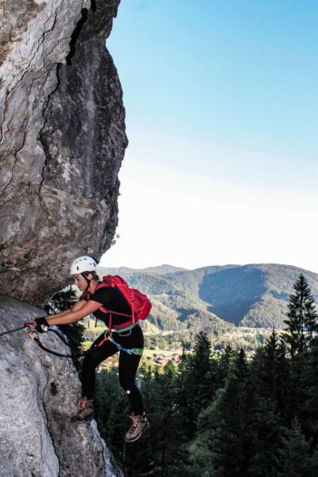 Der Klettersteig am Hausbach ist zwar mit 400 Metern nicht besonders lang, trotzdem bietet er viel Varianz. Von Seilbrücke über Holzbalken bis Baumstammbrücke ist da alles dabei. Die Holzbalken verlaufen unter einem überhängenden Felsen und man muss sie geduckt und nach hinten gelehnt bezwingen. Das erfordert einiges an Armkraft und Bauchmuskeln und lässt nicht viel Zeit fürs Umhaken – für mich ideal mit dem Skyriser Set! Die weitere Tour verläuft absolut machbar und zuletzt wird man auf der Baumstammbrücke mit einem tollen Blick ins Tal belohnt.