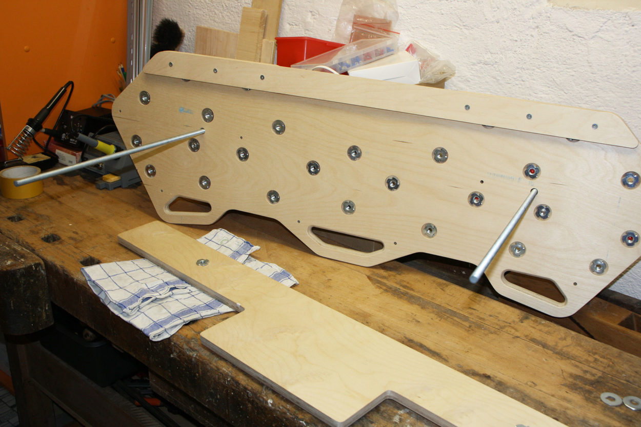 Montieren der Gewindestangen am Basewood. | Foto: Sophie Arnold - Anstecken der Gegenholzleiste und „lockeres Anschrauben mittels der Unterlegscheiben und der Muttern.