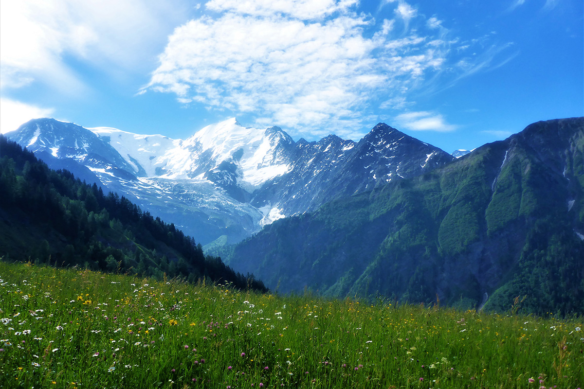 Chamonix, Frankreich: Knapp 10.000 Einwohner, Hotels in der Stadt und Zeltplätze im Nachbarort Les Bossons. Eine Information für Touristen, die eine grobe Karte der Rundwanderung Tour du Mont Blanc bereithält – ein ideales Basislager für den Trip. Ich nehme den Bus um 7.19 Uhr nach Les Houches, dem „üblichen“ Start. Keine drei Stunden und 600 schweißtreibende Höhenmeter später genieße ich die Aussicht vom ersten Bergpass, dem Col de Voza.